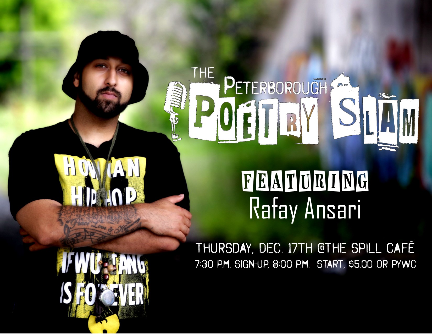 Rafay also competed with the Guelph Poetry Slam Team at the Canadian Festival of Spoken Word(CFSW) in November of 2013 where they placed 2nd in the country. As well as placing 1st in the province at “Slamtario”. In 2014 he returned to the Guelph team where they placed 2nd at Slamtario and 3rd at CFSW. In 2015 He returned to CFSW where he competed with the Kitchener Poetry Slam Team, where they placed 5th.